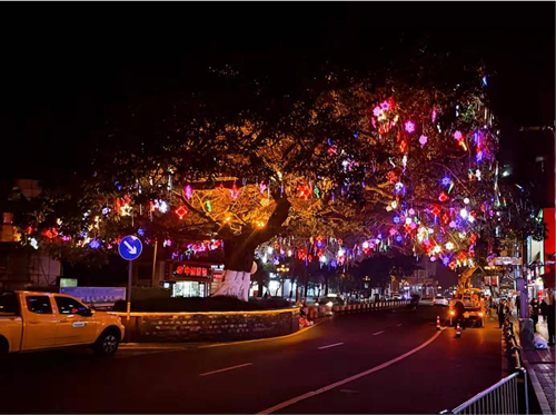 位于新民街、朝陽(yáng)街、大北街路口幾處的雅安標(biāo)志性市樹(shù)黃葛樹(shù)上都安裝滿了大紅燈籠、滿天星彩燈和漂亮多彩的掛件,樹(shù)下綠化帶采用了麥穗和花朵造型的插地?zé)暨M(jìn)行點(diǎn)綴。黃色的麥穗燈光與大紅燈籠交相輝映,描繪出一幅歲物豐成的美好景象,讓廣大市民切身感受到了濃濃的年味。