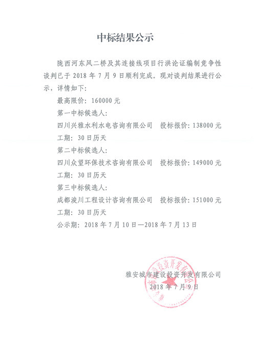 隴西河?xùn)|風(fēng)二橋及其連接線項(xiàng)目行洪論證報(bào)告編制中標(biāo)結(jié)果公示