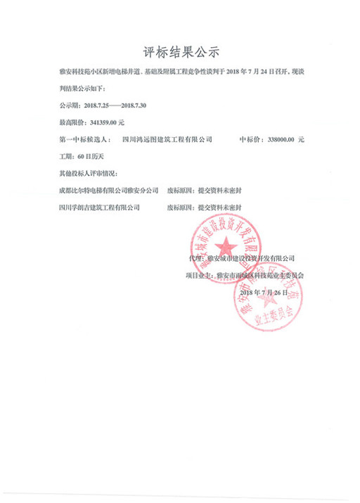 關(guān)于雅安科技苑小區(qū)新增電梯井道、基礎(chǔ)及附屬工程競(jìng)爭(zhēng)性談判的結(jié)果公示