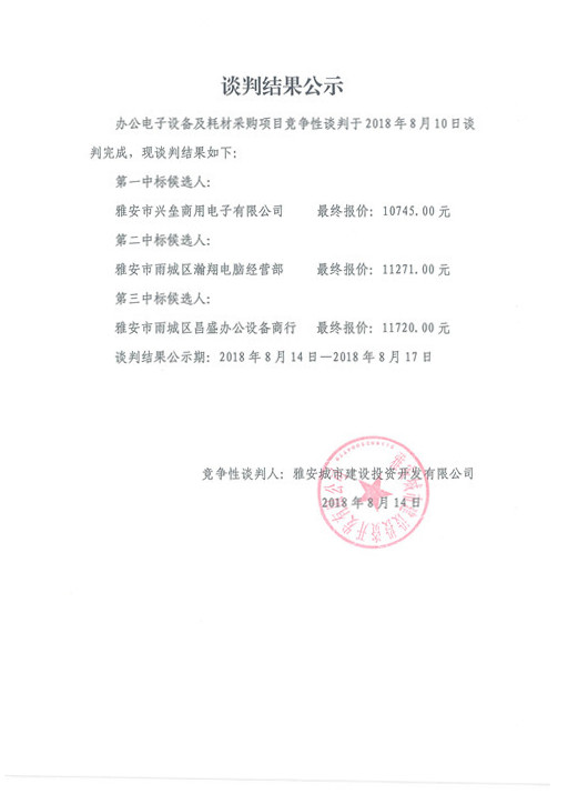 雅安城市建設(shè)投資開發(fā)有限公司辦公電子設(shè)備及耗材采購(gòu)項(xiàng)目——競(jìng)爭(zhēng)性談判結(jié)果公示