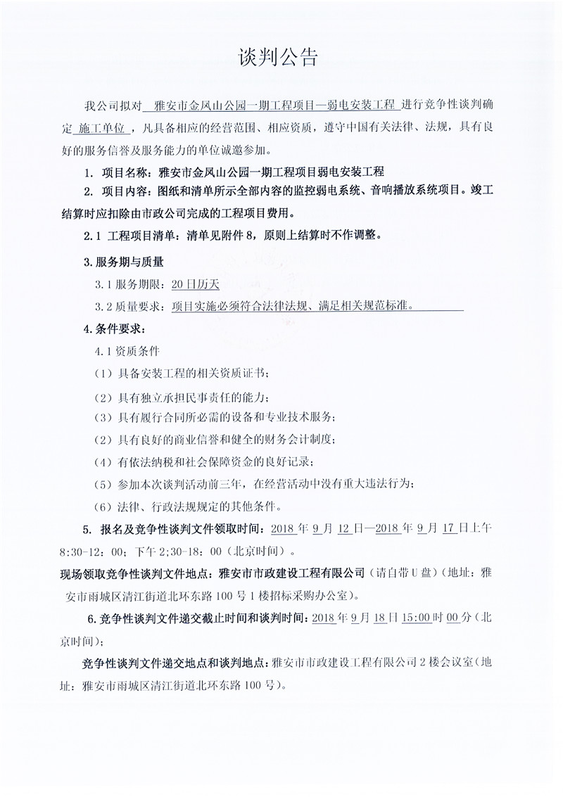 雅安市金鳳山公園一期工程項(xiàng)目——弱電安裝工程(競(jìng)爭(zhēng)談判公告)