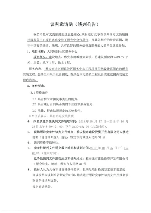 大興順路社區(qū)服務(wù)中心項(xiàng)目水電安裝工程專業(yè)分包單位競爭性談判公告