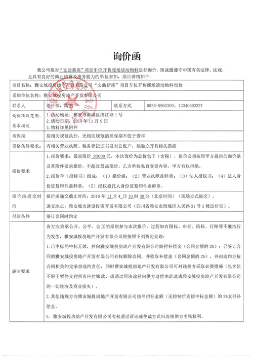 雅安城投房地產開發(fā)有限公司“文曲新座”項目車位開售暖場活動物料詢價函