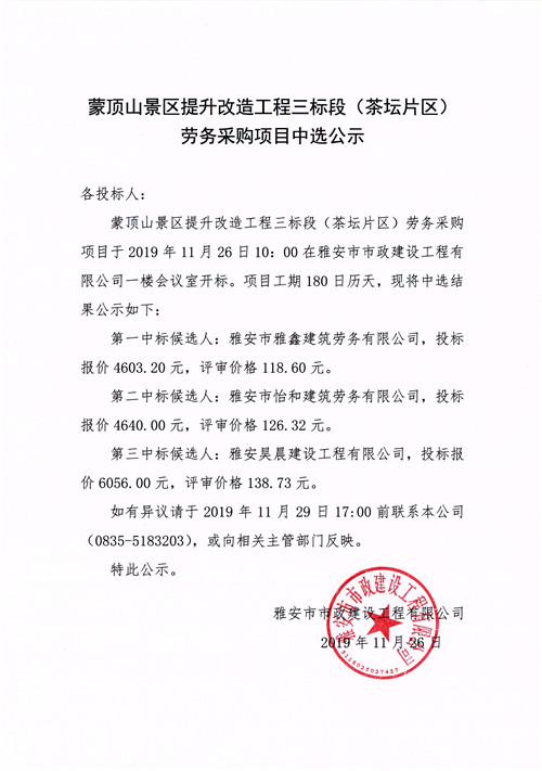 蒙頂山景區(qū)提升改造工程三標段(茶壇片區(qū))勞務采購項目招標中選公示