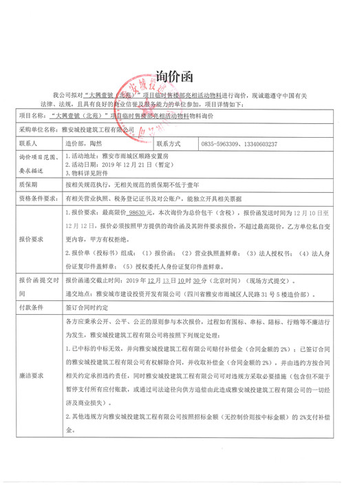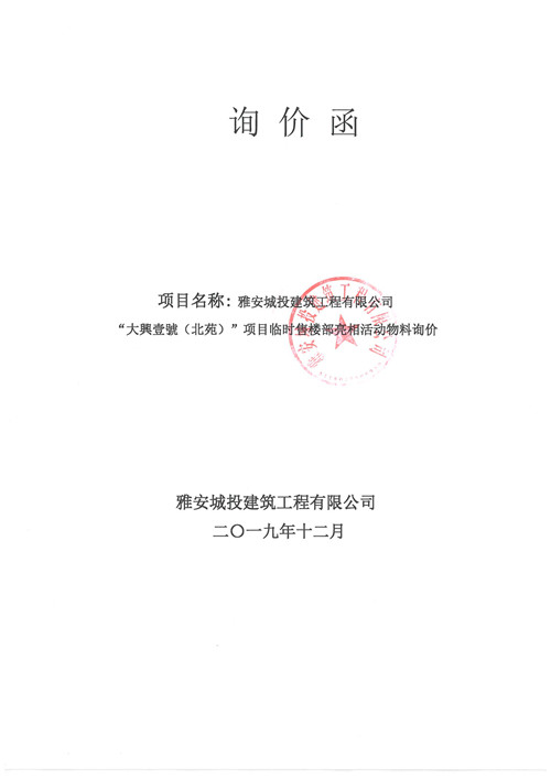 大興壹號(北苑)項(xiàng)目臨時(shí)售樓部亮相活動物料詢價(jià)函