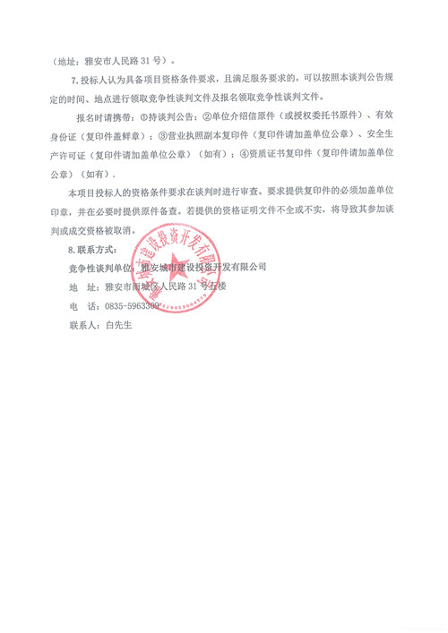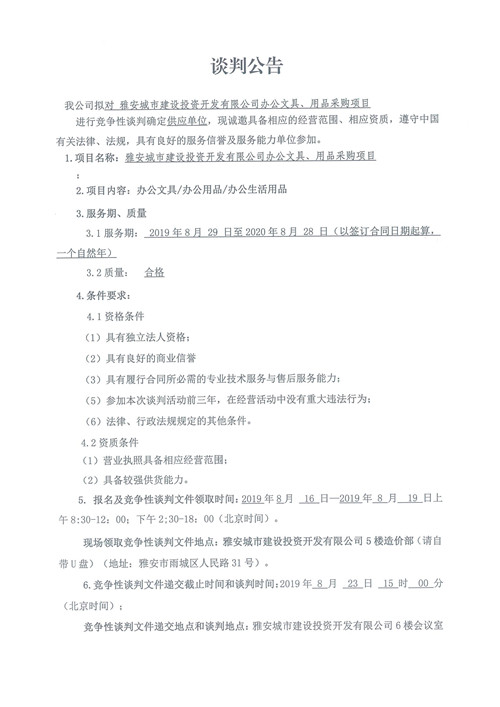 雅安城市建設(shè)投資開發(fā)有限公司辦公文具、用品采購項目競爭性談判公告