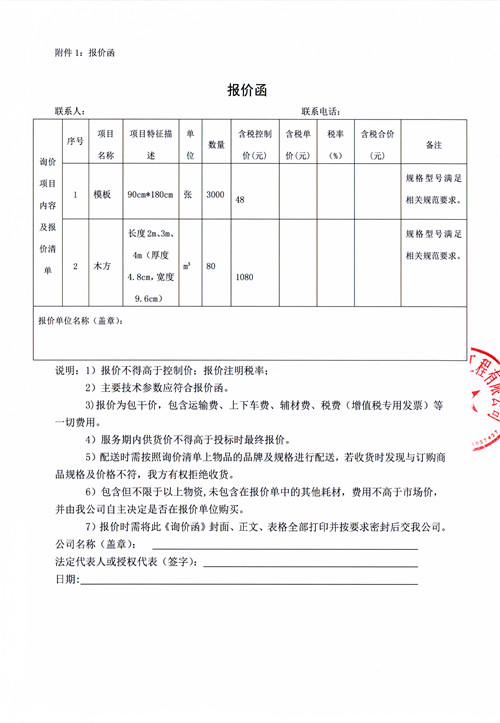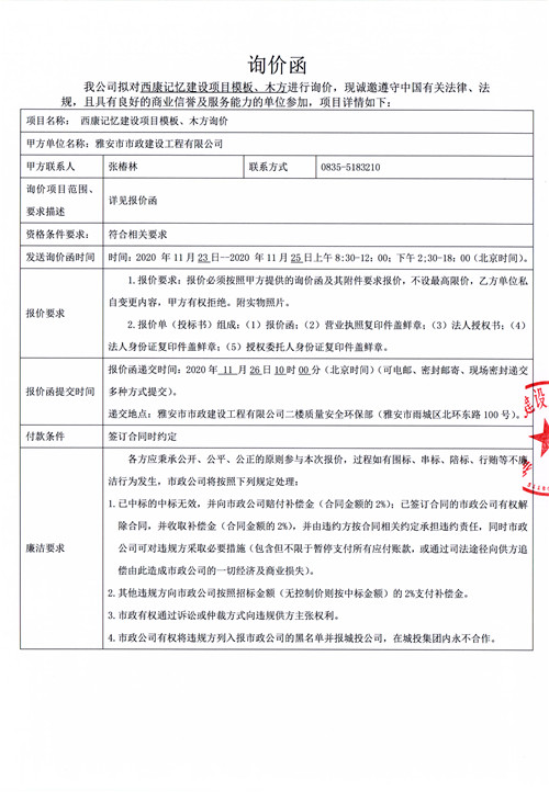 市政公司西康記憶建設(shè)項(xiàng)目模板、木方詢(xún)價(jià)函