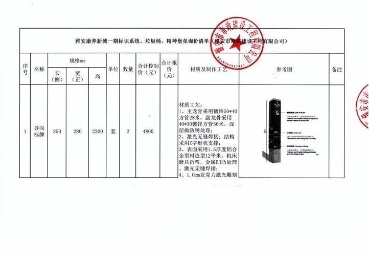 雅安康養(yǎng)新城一期標(biāo)識(shí)系統(tǒng)、垃圾桶、精神堡壘詢價(jià)清單(雅安市市政建設(shè)工程有限公司)