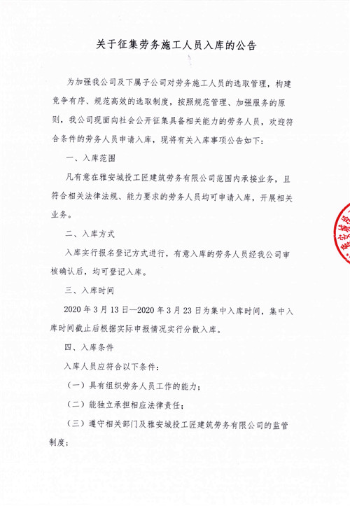 關(guān)于征集勞務(wù)施工人員入庫的公告