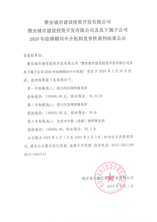 雅安城市建設(shè)投資開(kāi)發(fā)有限公司及其下屬子公司2020年法律顧問(wèn)中介機(jī)構(gòu)競(jìng)爭(zhēng)性談判結(jié)果公示