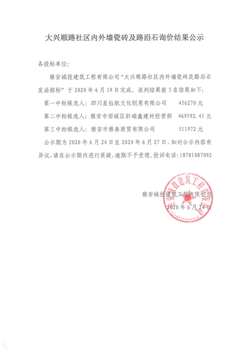 城投建工公司大興順路社區(qū)內(nèi)外墻瓷磚及路沿石詢價(jià)結(jié)果公示