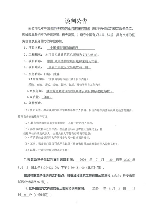 城投建工公司中國·藏茶博物館項目電梯采購安裝競爭性談判公告
