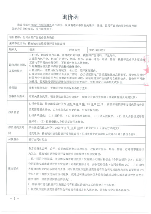 雅安城市建設(shè)投資開發(fā)有限公司公司內(nèi)部廣告制作服務(wù)詢價函