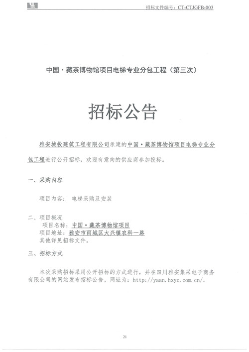 城投建工公司中國·藏茶博物館項目電梯專業(yè)分包工程招標公告(第三次)