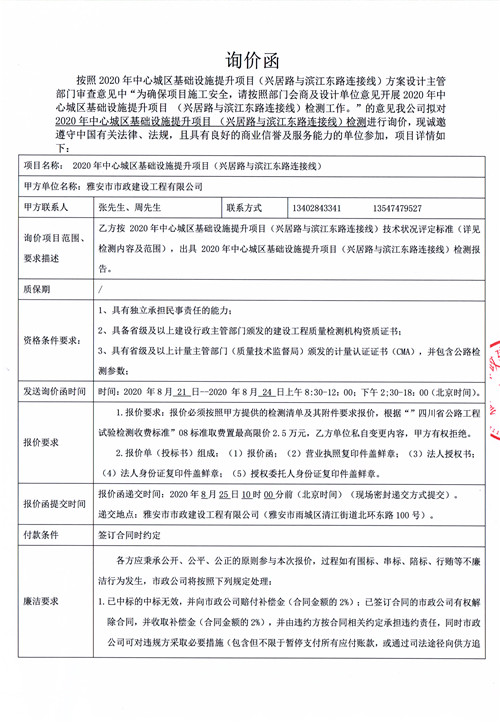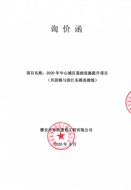 雅安市市政建設(shè)工程有限公司2020年中心城區(qū)基礎(chǔ)設(shè)施提升項目(興居路與濱江東路連接線)詢價函