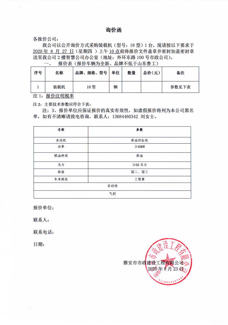 雅安市市政建設(shè)工程有限公司采購(gòu)裝載機(jī)(型號(hào):18型)詢價(jià)函