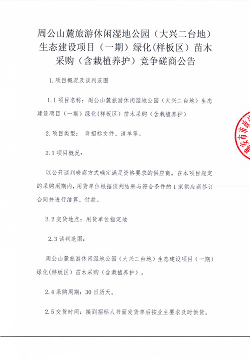 周公山麓旅游休閑濕地公園(大興二臺(tái)地)生態(tài)建設(shè)項(xiàng)目(一期)綠化(樣板區(qū))苗木采購(gòu)(含栽植養(yǎng)護(hù))競(jìng)爭(zhēng)磋商公告
