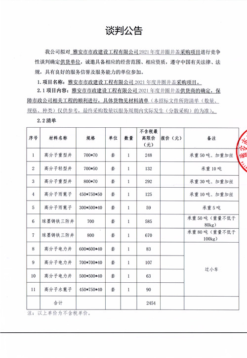 雅安市市政建設工程有限公司2021年井圈井蓋采購項目競爭性談判公告