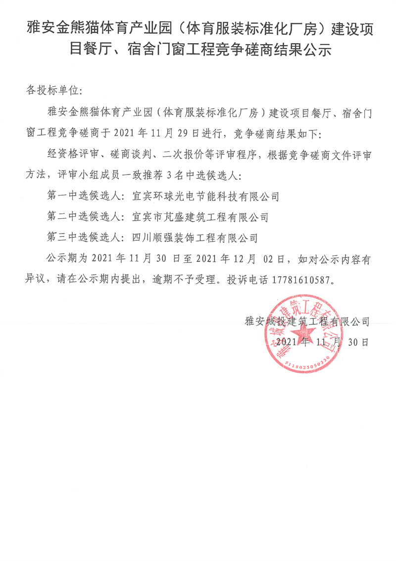 雅安金熊貓體育產業(yè)園(體育服裝標準化廠房)建設項目餐廳、宿舍門窗工程競爭磋商結果公示