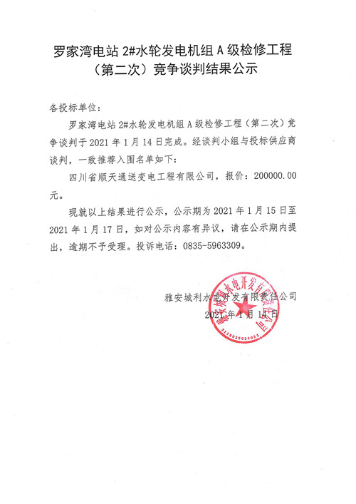 城利水電公司羅家灣電站2#水輪發(fā)電機(jī)組A級檢修工程(第二次)競爭性談判結(jié)果公示