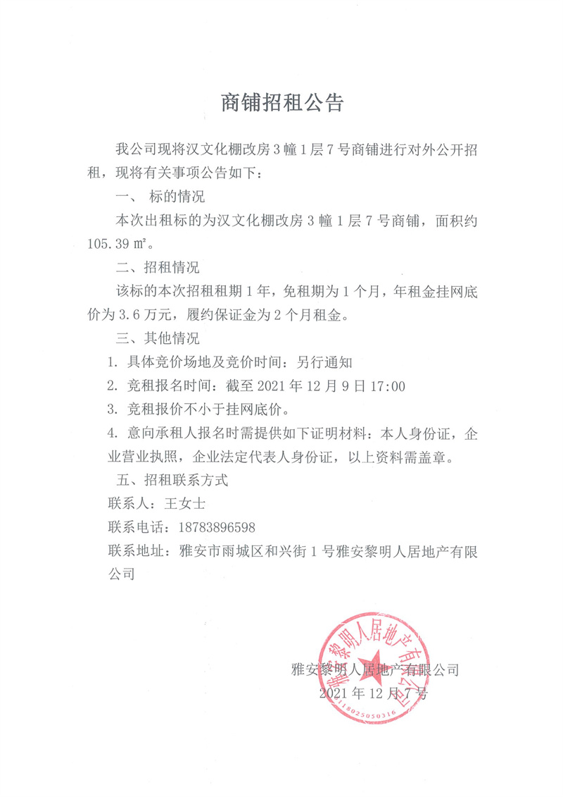 漢文化棚改房3幢1層7號商鋪招租公告