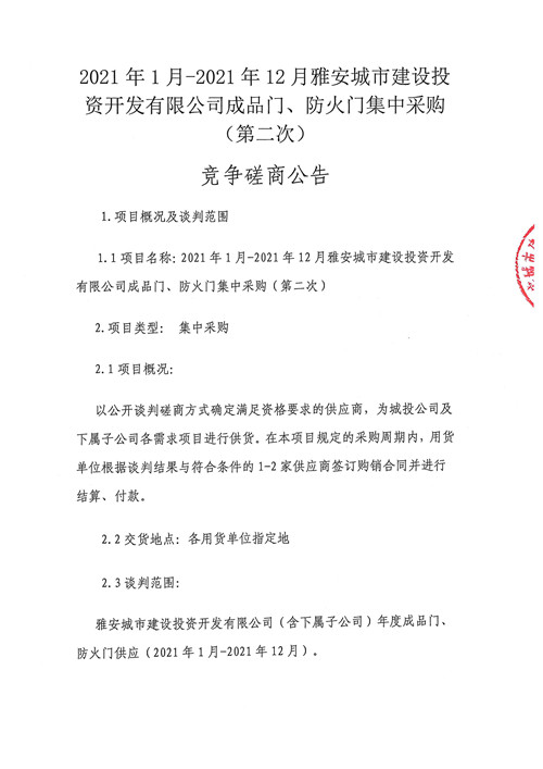 2021年1月-2021年12月雅安城市建設(shè)投資開發(fā)有限公司成品門、防火門集中采購(gòu)(第二次)競(jìng)爭(zhēng)磋商公告
