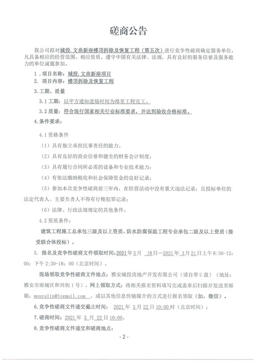 城投.文曲新座樓頂拆除及恢復(fù)工程競爭性磋商公告(第五次)