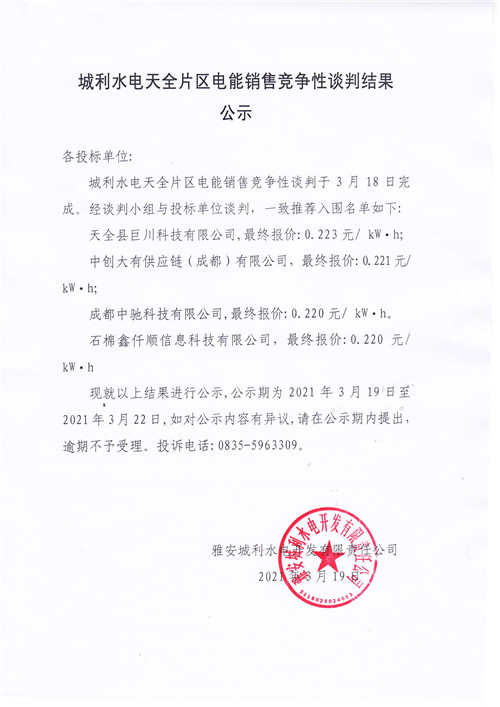 城投水電公司天全片區(qū)電站電能銷售競爭性談判結(jié)果公示