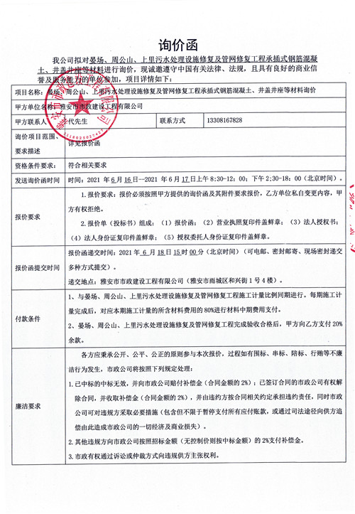 雅安城投市政公司晏場、周公山、上里污水處理設施修復及管網修復工程承插式鋼筋混凝土、井蓋井座等材料詢價函