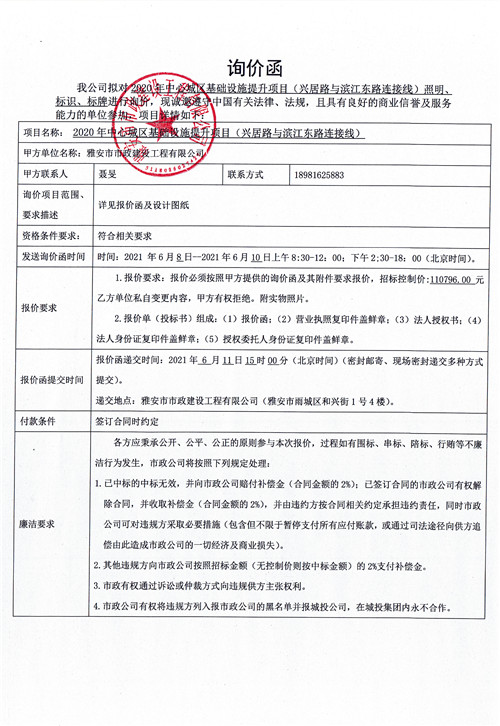 雅安市政公司2020年中心城區(qū)基礎(chǔ)設(shè)施提升項目(興居路與濱江東路連接線)照明、標(biāo)識、標(biāo)牌詢價函