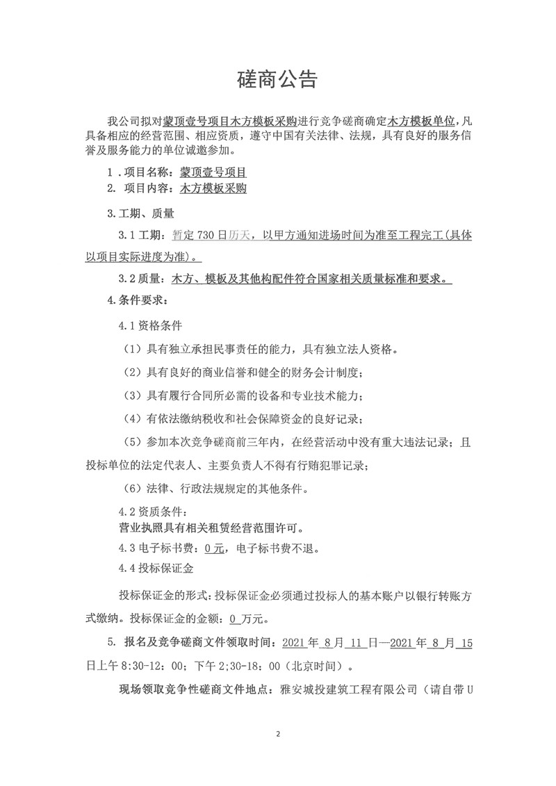 城投建工公司蒙頂壹號項目木方模板采購競爭磋商公告