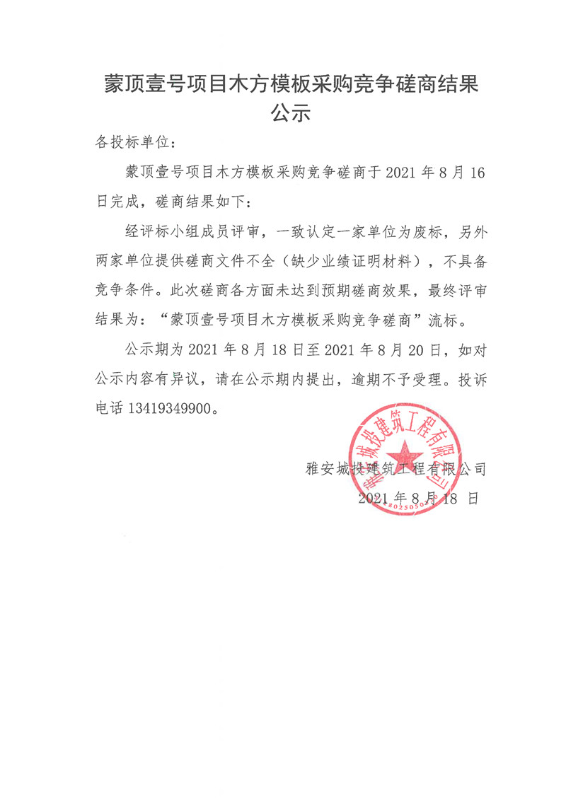 城投建工公司蒙頂壹號(hào)項(xiàng)目木方模板采購(gòu)競(jìng)爭(zhēng)磋商結(jié)果公示