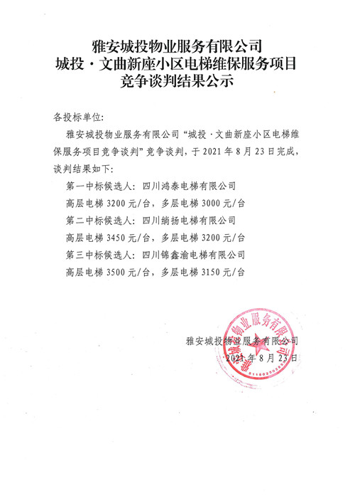 城投物業(yè)公司城投·文曲新座小區(qū)電梯維保服務(wù)項(xiàng)目競(jìng)爭(zhēng)談判結(jié)果公示