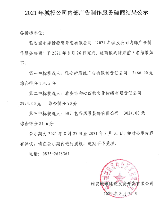 2021年城投公司內部廣告制作服務磋商結果公示