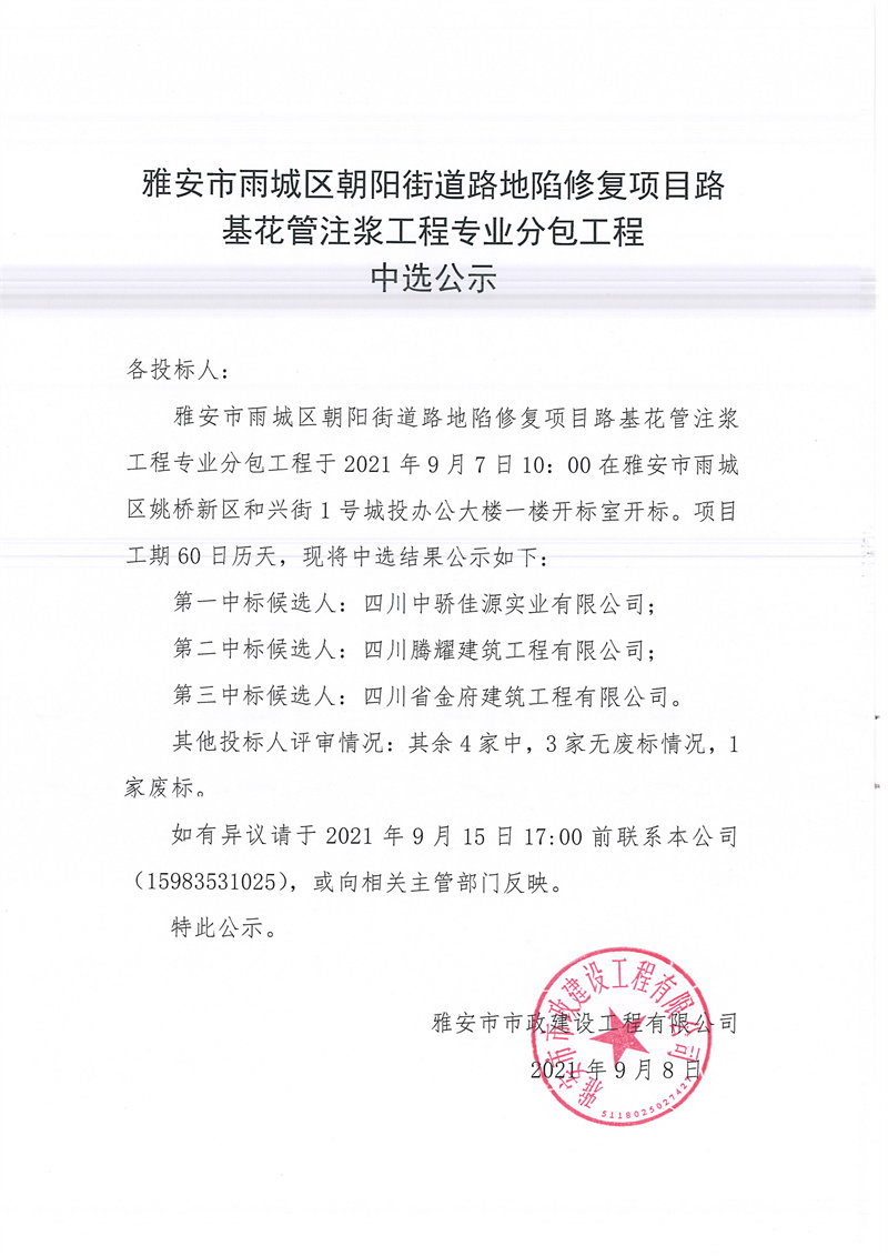 雅安市雨城區(qū)朝陽(yáng)街道路地陷修復(fù)項(xiàng)目路基花管注漿工程專業(yè)分包工程中選公示