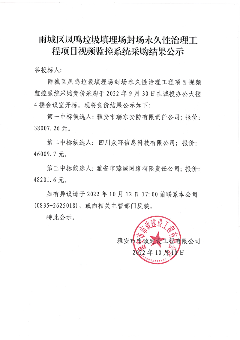 雨城區(qū)鳳鳴垃圾填埋場永久性封場治理工程項目視頻監(jiān)控系統(tǒng)采購結(jié)果公示