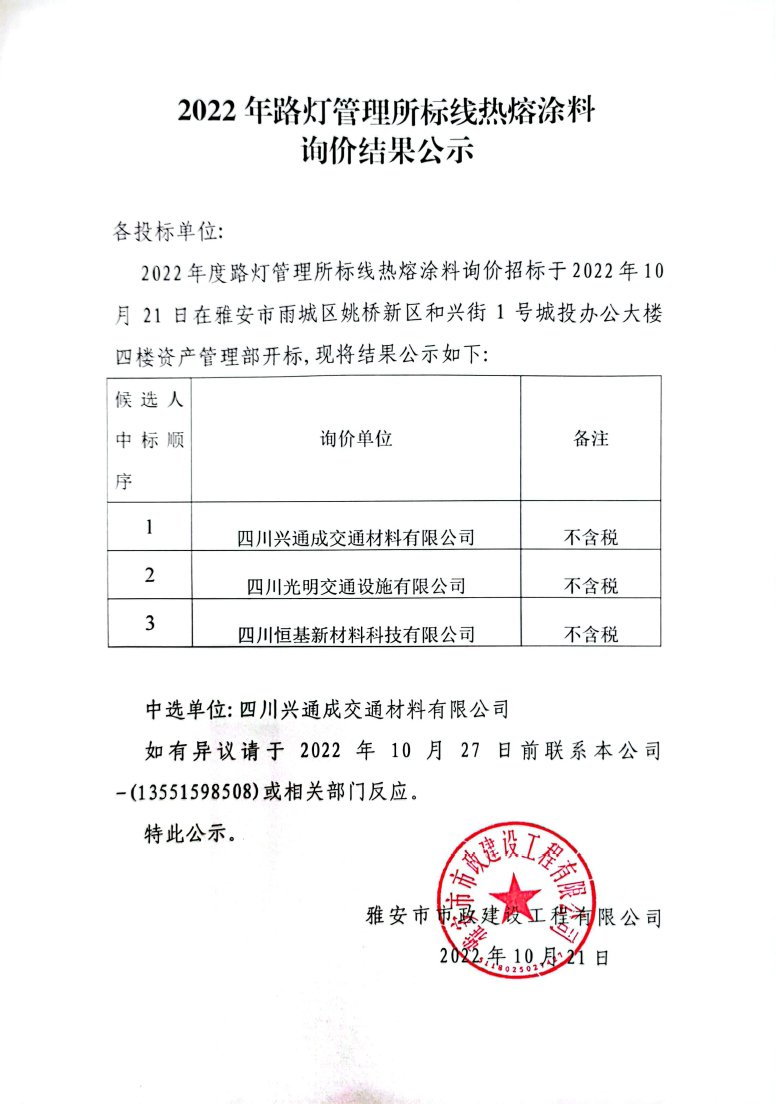 2022年路燈管理所標線熱熔涂料詢價結果公示