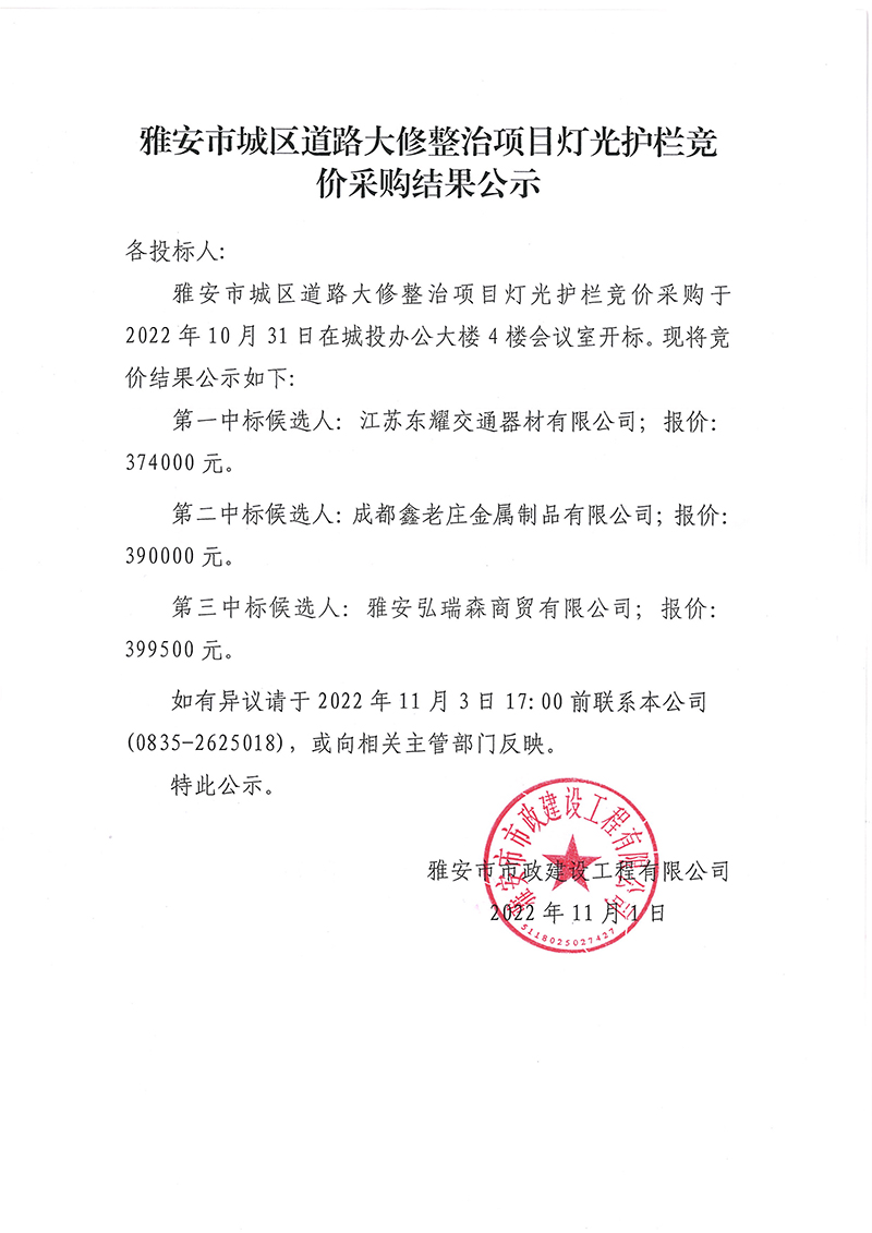 雅安市城區(qū)道路大修整治項(xiàng)目燈光護(hù)欄采購(gòu)競(jìng)價(jià)結(jié)果公告