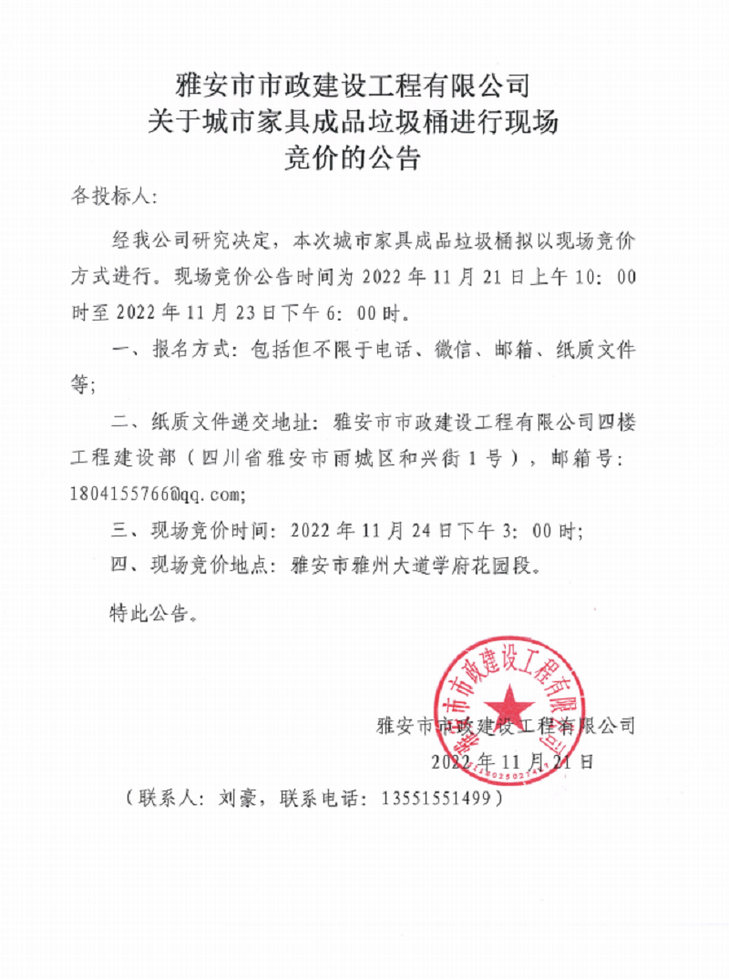 雅安市市政建設(shè)工程有限公司關(guān)于城市家具成品垃圾桶進行現(xiàn)場競價的公告