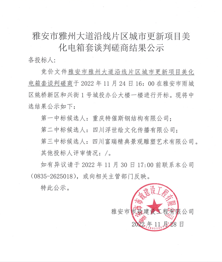 雅安市雅州大道沿線片區(qū)城市更新項目美化電箱套談判磋商結果公示