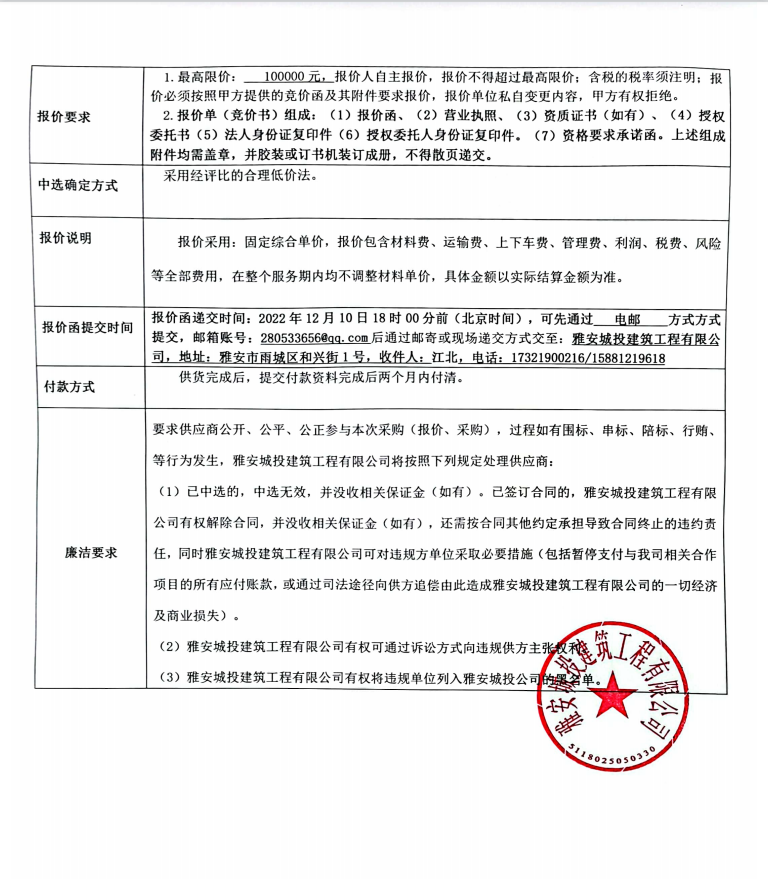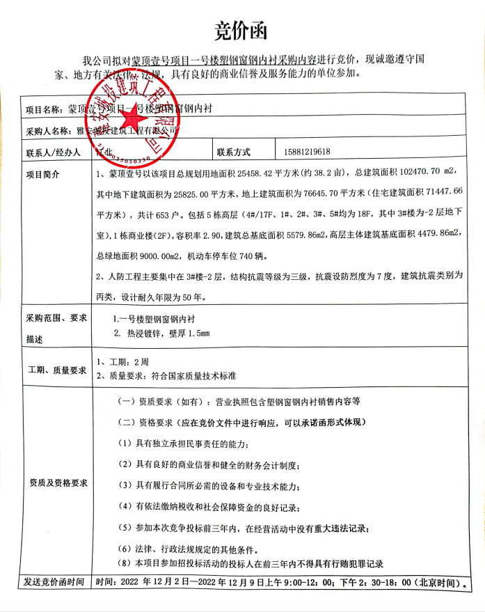 蒙頂壹號項目一號樓塑鋼窗鋼內(nèi)襯競價公告