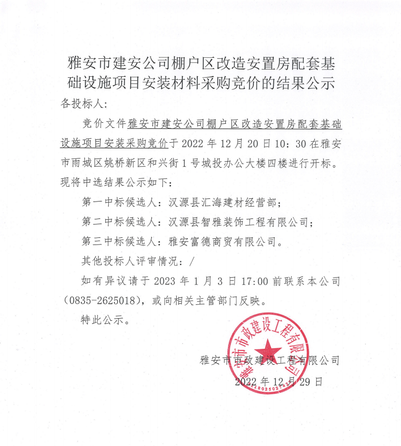 雅安市建安公司棚戶區(qū)改造安置房配套基礎(chǔ)設(shè)施項(xiàng)目安裝材料采購(gòu)競(jìng)價(jià)結(jié)果公示
