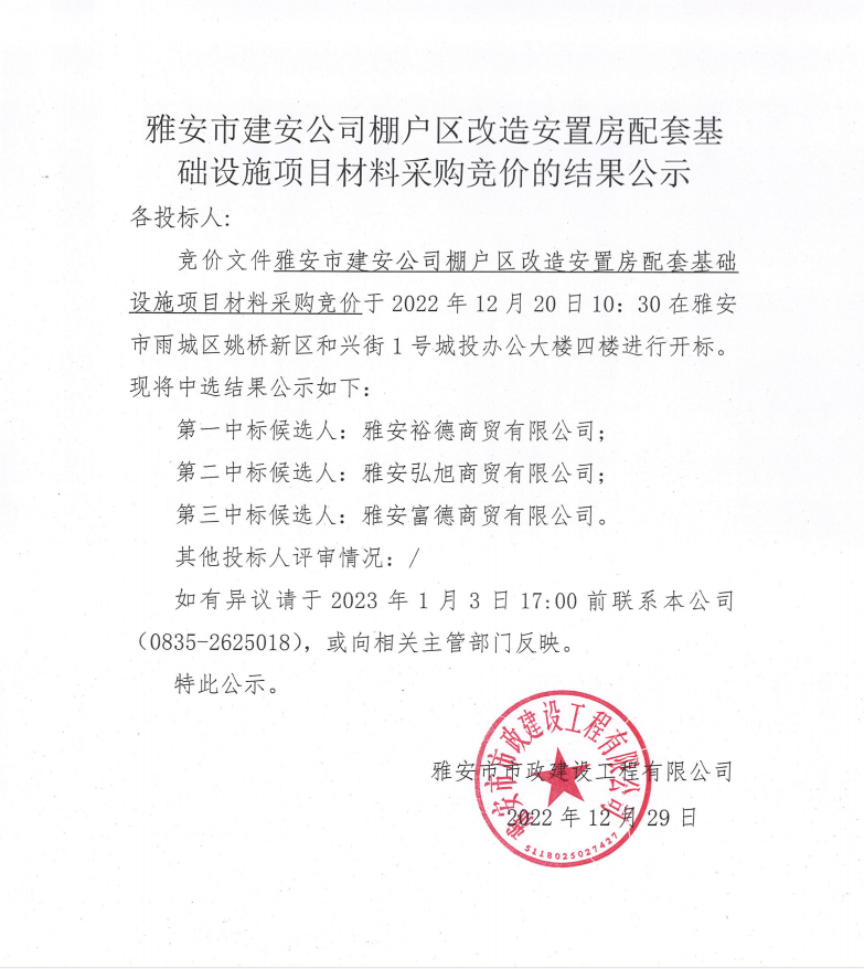 雅安市建安公司棚戶區(qū)改造安置房配套基礎設施項目材料采購競價結(jié)果公示