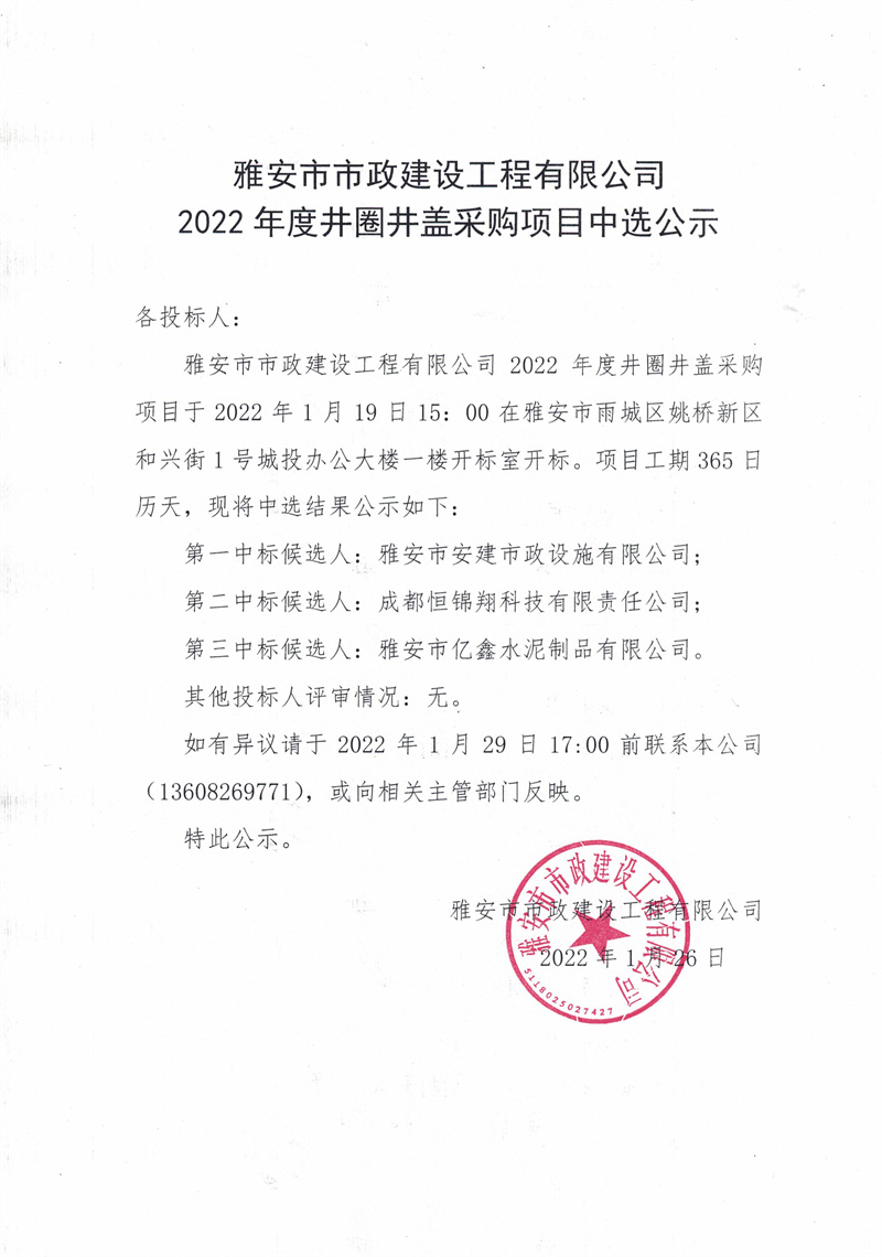 雅安市市政建設(shè)工程有限公司2022年度井圈井蓋采購項(xiàng)目中選公示