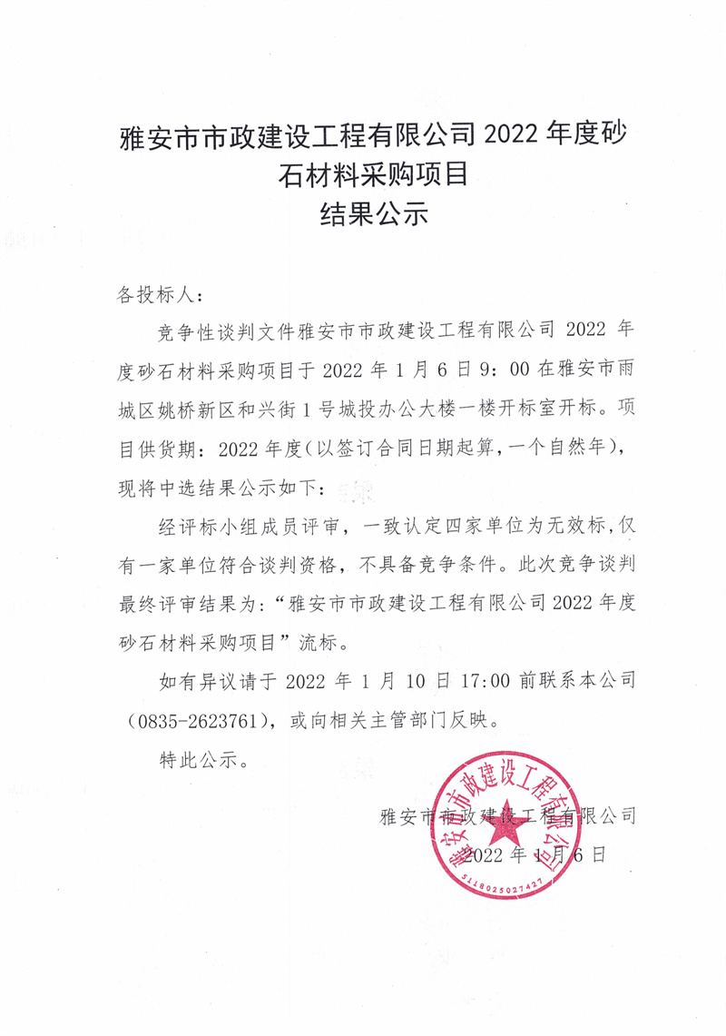 雅安市市政建設(shè)工程有限公司2022年度砂石材料采購項(xiàng)目結(jié)果公示