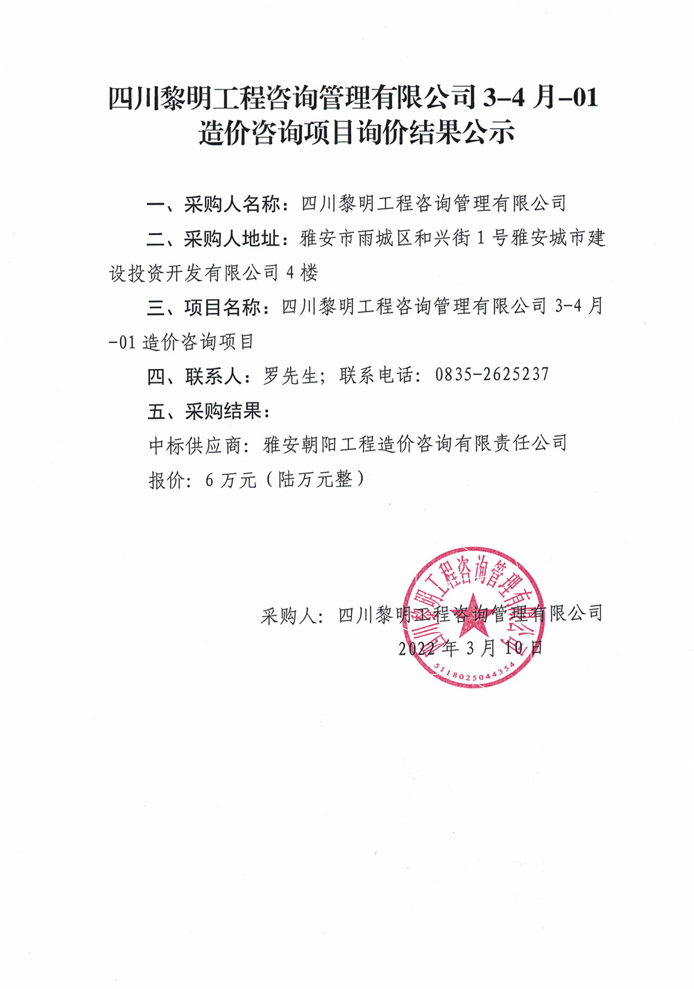 四川黎明工程咨詢管理有限公司3-4月-01造價咨詢項(xiàng)目詢價結(jié)果公示