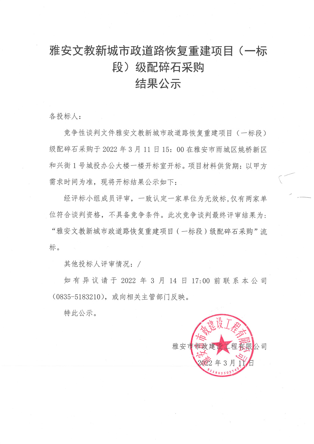 雅安文教新城市政道路恢復(fù)重建項(xiàng)目(一標(biāo)段)級配碎石采購結(jié)果公示