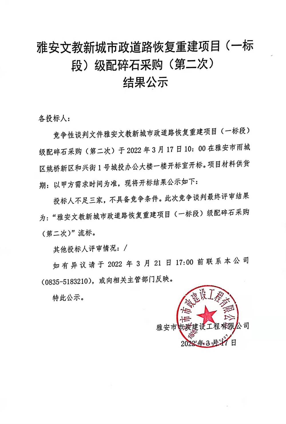雅安文教新城市政道路恢復(fù)重建項(xiàng)目(一標(biāo)段)級(jí)配碎石采購(gòu)(第二次)結(jié)果公示