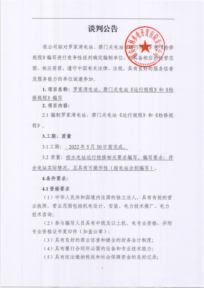 羅家灣電站、禁門(mén)關(guān)電站《運(yùn)行規(guī)程》和《檢修規(guī)程》編寫(xiě)競(jìng)爭(zhēng)性談判公告
