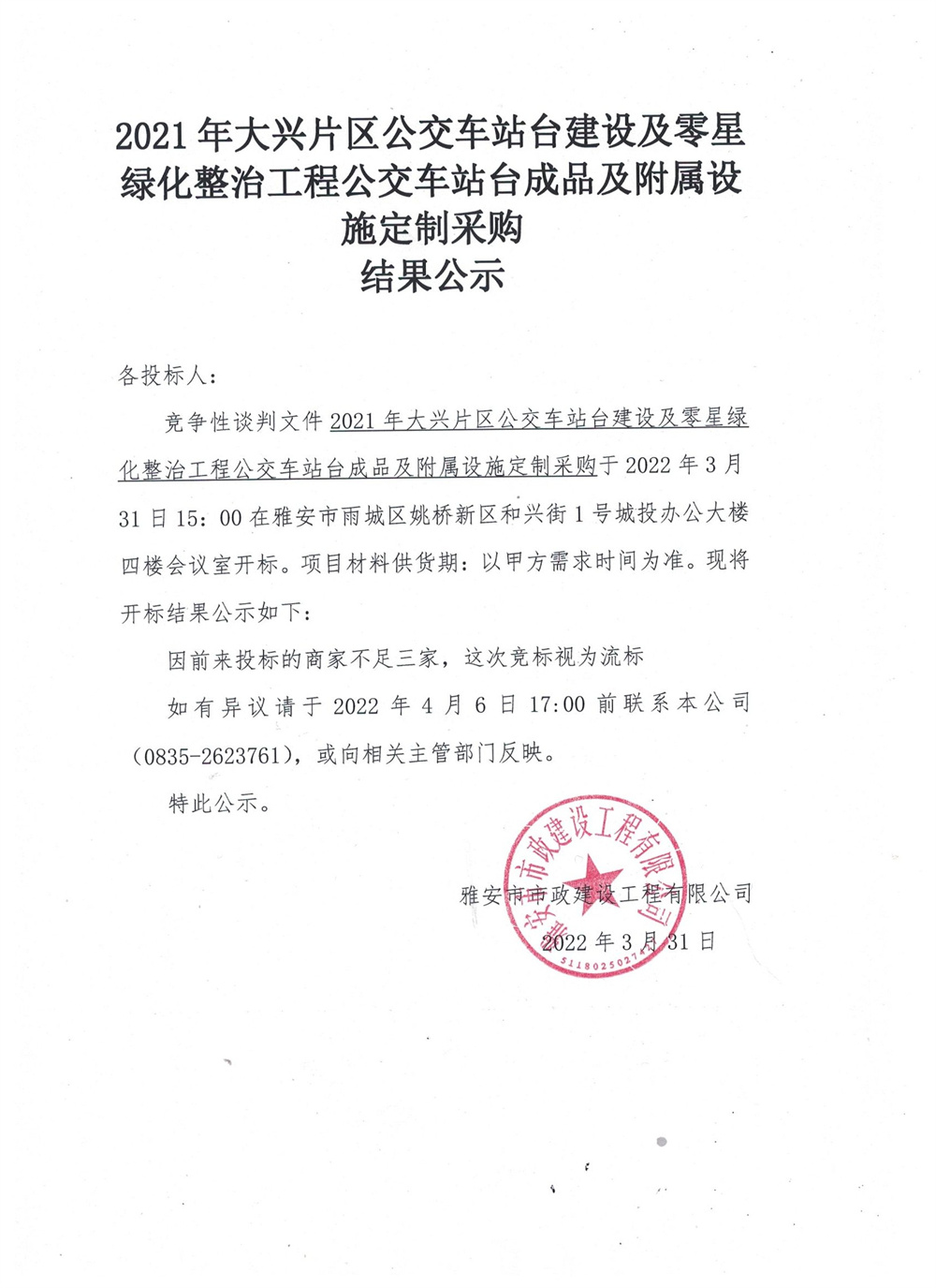 2021年大興片區(qū)公交站臺(tái)建設(shè)及零星綠地整治工程公交站臺(tái)成品及附屬設(shè)施定制采購(gòu)結(jié)果公示
